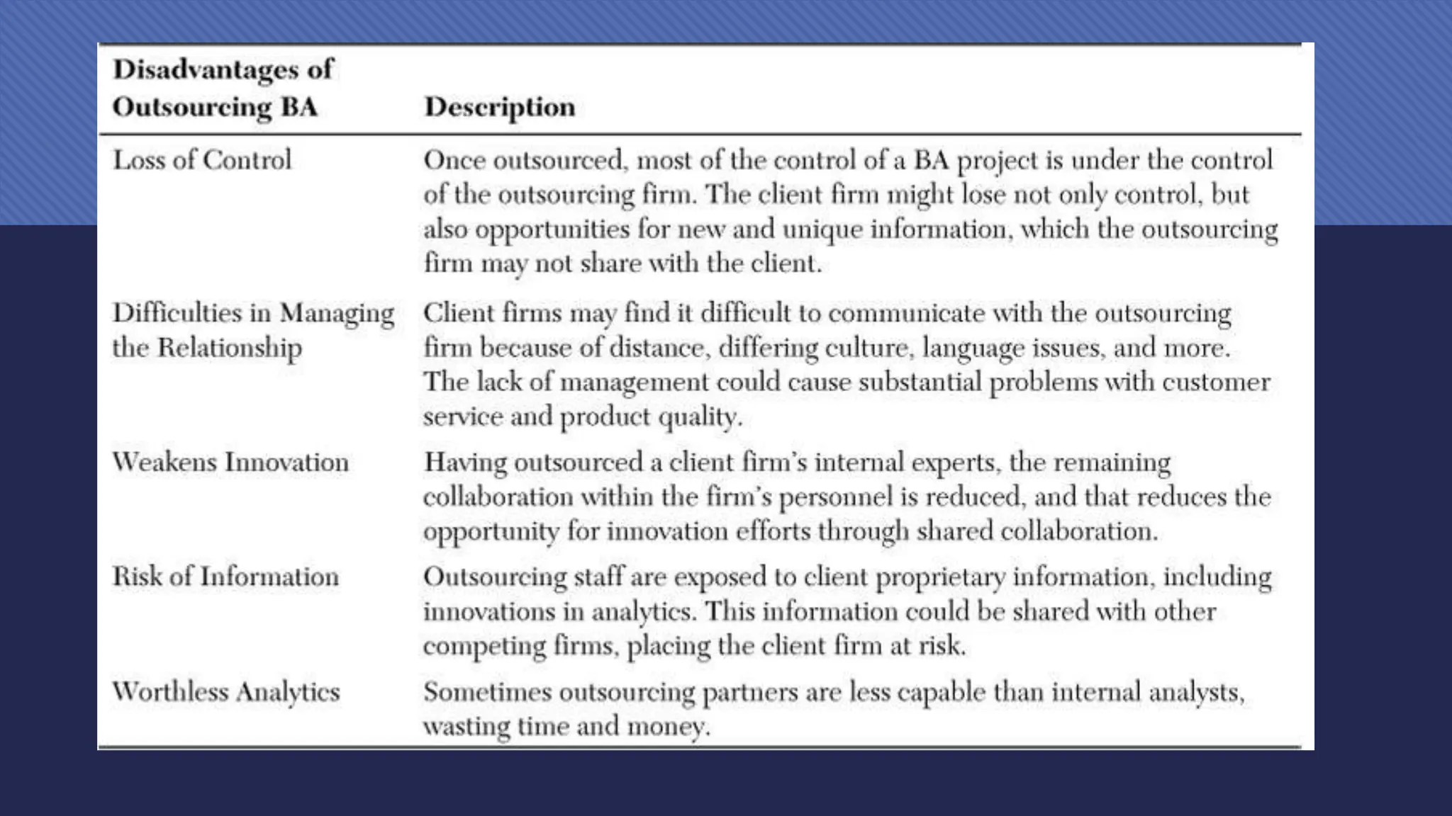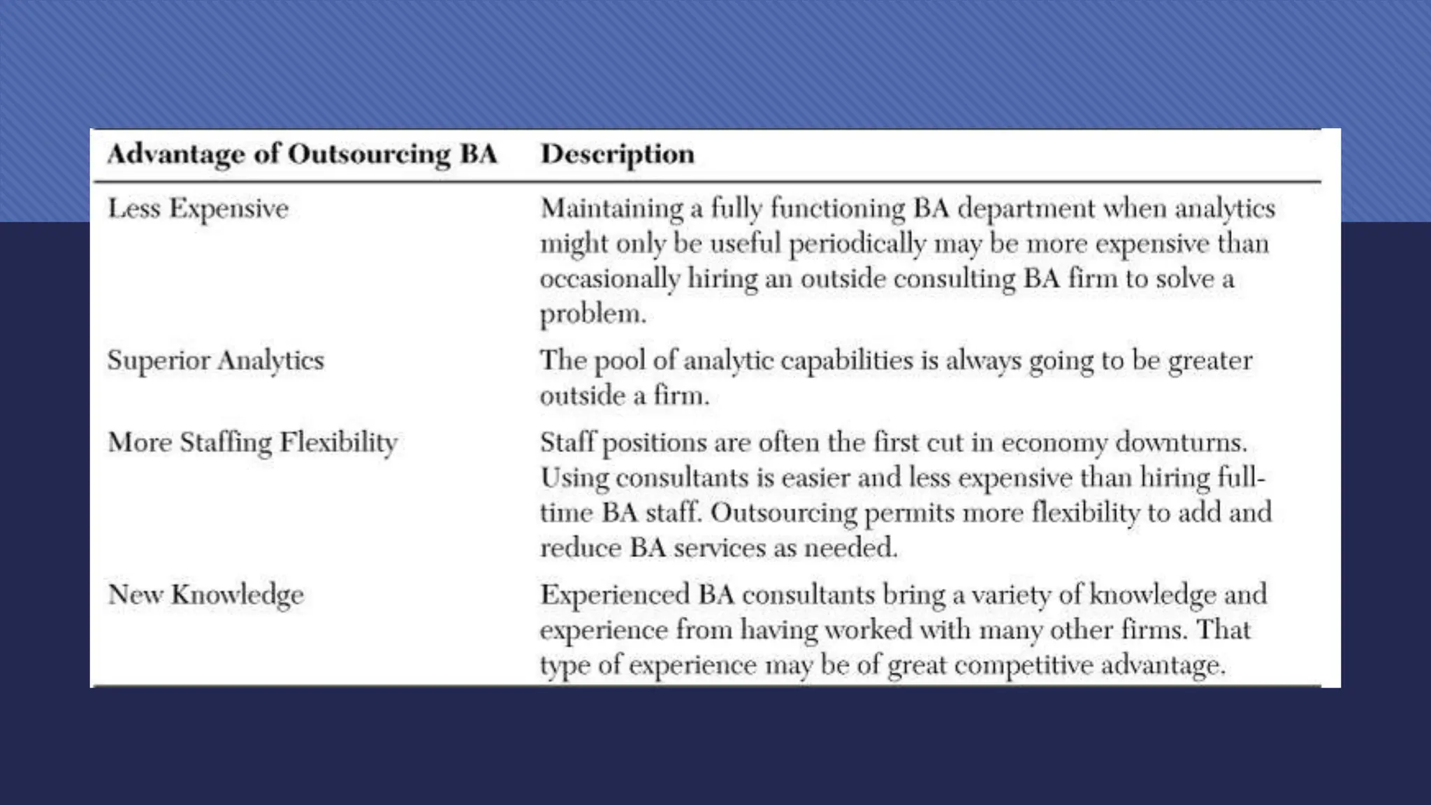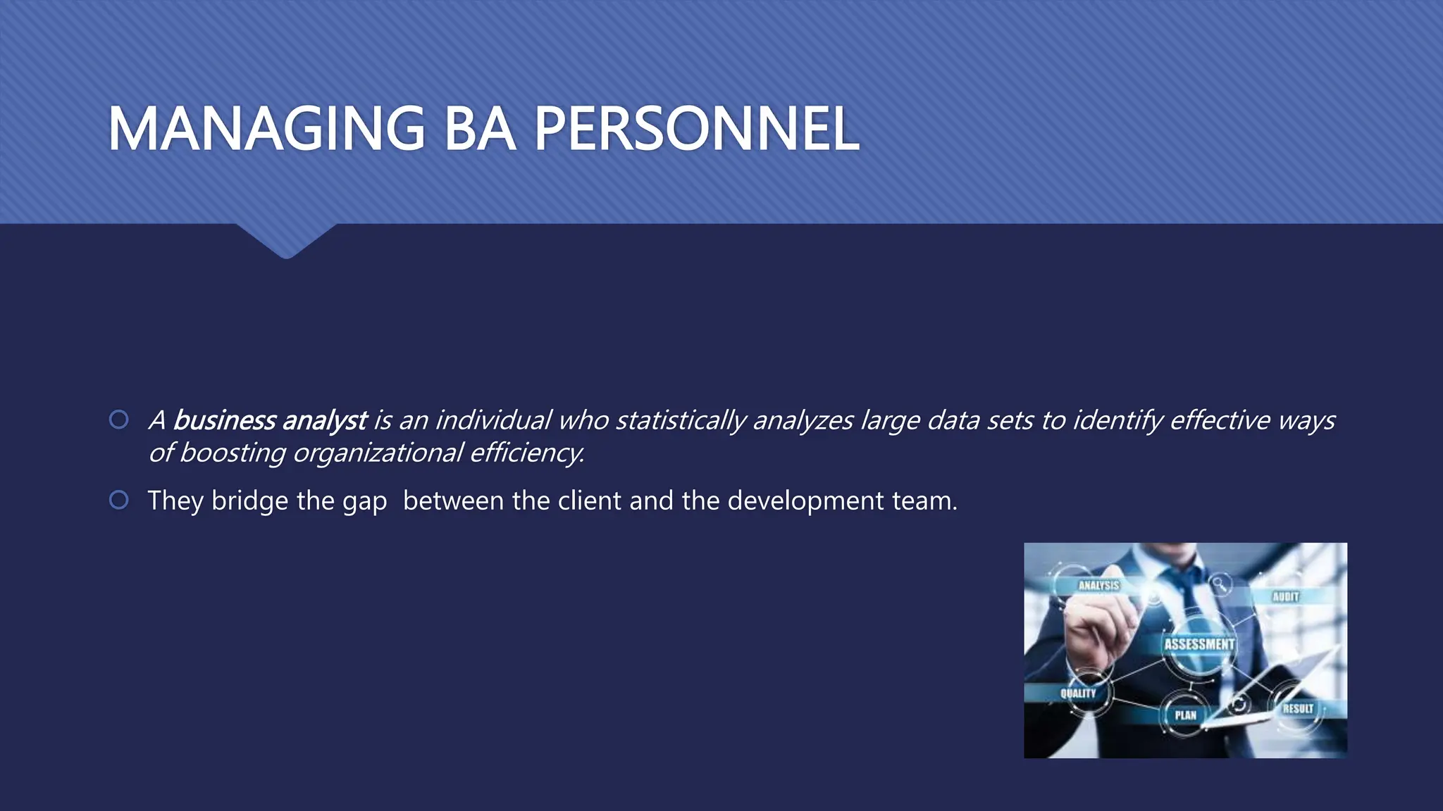 The document outlines the role and skills of business analysts (BAs), including their responsibilities in various phases of project management and the types of data they work with. It emphasizes the importance of data quality, primary and secondary data sources, and the use of various technologies, methodologies, and organizational structures in business analytics. Additionally, it addresses challenges in managing BAs, ensuring data quality, and evaluating the contribution of analytics to organizational performance.