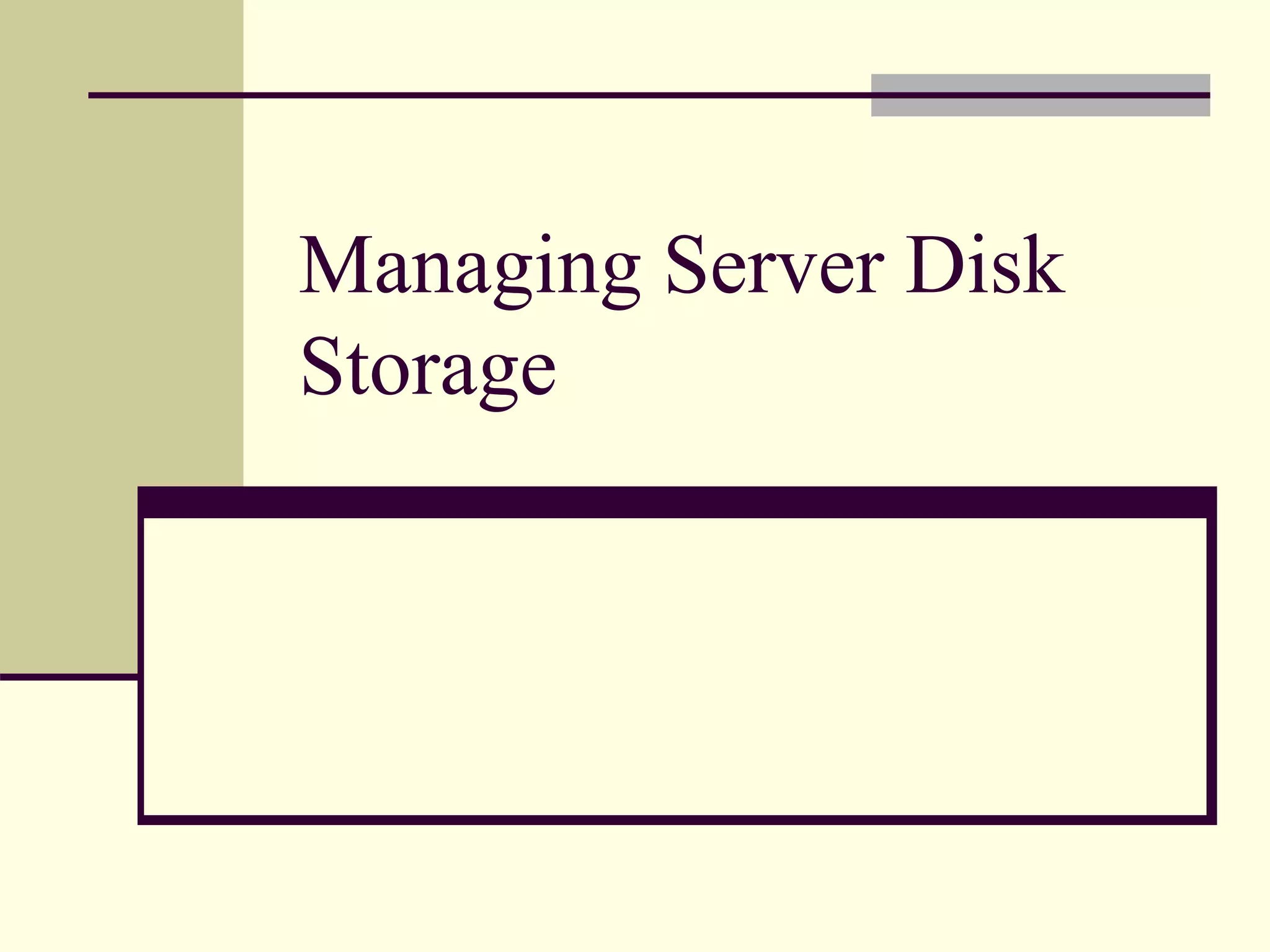 This document discusses disk storage and disk configurations in Windows Server 2008. It describes the differences between basic disks and dynamic disks. Basic disks use partitions, while dynamic disks use volumes that provide features like spanning across multiple disks. It also covers converting between disk types, the two partition styles (MBR and GPT), and the five types of dynamic volumes (simple, spanned, striped, mirrored, RAID-5). The Local Disk Manager and Virtual Disk Service manage dynamic disks and storage configurations.
