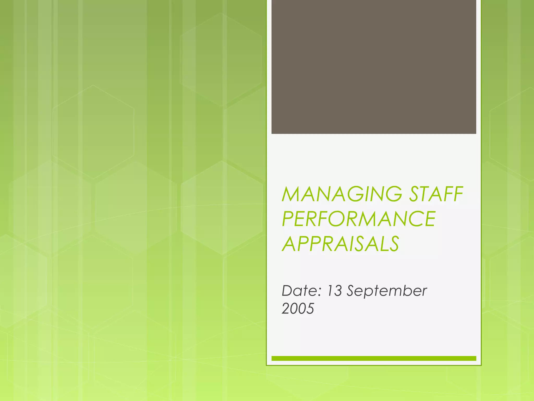 The document outlines the principles and procedures for managing staff performance appraisals, emphasizing the importance of regular performance reviews to enhance productivity and staff development. It details the responsibilities of both reviewers and appraisees, as well as the steps and policies for conducting effective appraisal meetings every six months. Additionally, the document highlights the role of appraisals in setting objectives, assessing training needs, and fostering employee motivation.