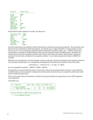 The document discusses the importance of statistics in optimizing SQL query performance through the Oracle query optimizer. It explains how accurate statistical data allows the optimizer to select the most efficient execution plans, thereby enhancing query performance. Additionally, it covers methods for collecting statistics and emphasizes the need for tailored approaches based on specific application needs.