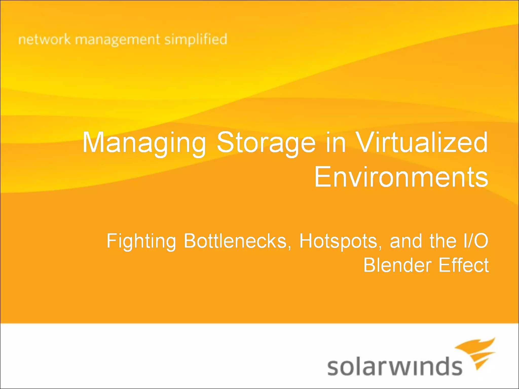 The document details a SolarWinds Geek Speak webcast focused on network management fundamentals, particularly in managing storage in virtualized environments. It emphasizes best practices for identifying and resolving storage performance issues, such as bottlenecks and the I/O blender effect, while encouraging participants to utilize a trial of SolarWinds' Virtual and Server Profiler for better understanding of the material. The session also provides insights into capacity forecasting and storage optimization to enhance management efficiency within shared storage infrastructures.