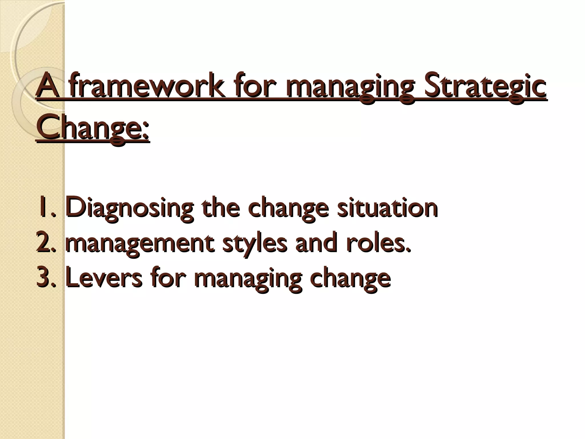 This document provides a framework for managing strategic change including diagnosing the type and context of change, analyzing forces for and against change, and identifying levers to manage change. It outlines four types of strategic change: adaptation, evolution, revolution, and reconstruction. The context of change is determined by factors like time, scope, preservation needs, diversity, capability, capacity, readiness, and power. Change is managed through styles like education, collaboration, and direction played by roles of change agents and strategic leadership. Levers for managing change involve structure, routines, symbols, politics, communication, and tactics.