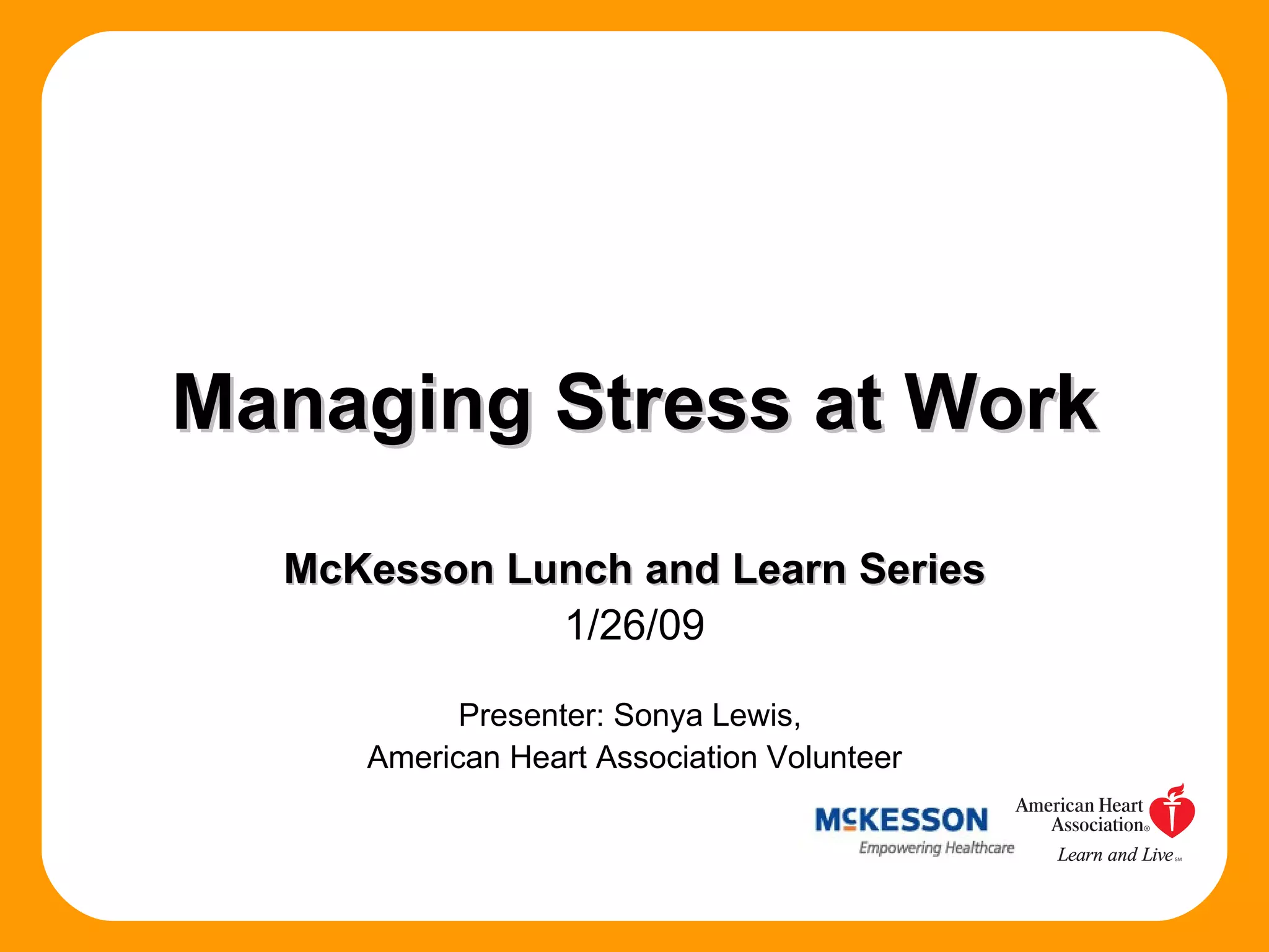 The document discusses a presentation on managing workplace stress, emphasizing the link between stress and heart disease, as well as the identification and management of worksite stressors. It outlines stress management strategies, including the ABCs of stress, personal actions, and organizational changes that can foster a less stressful work environment. The American Heart Association's guidance is highlighted, advocating for personal responsibility and resource utilization to address stress effectively.