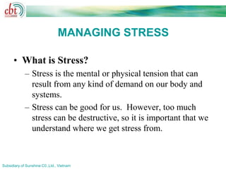 The document discusses the nature of stress, categorizing it as both a potential benefit and a destructive force when excessive. It outlines various sources of stress, signs of stress overload, and physical and psychological symptoms, as well as the difference between stress and distress. Finally, it suggests personal reflection for stress management while hinting at the need for broader organizational approaches to stress reduction.