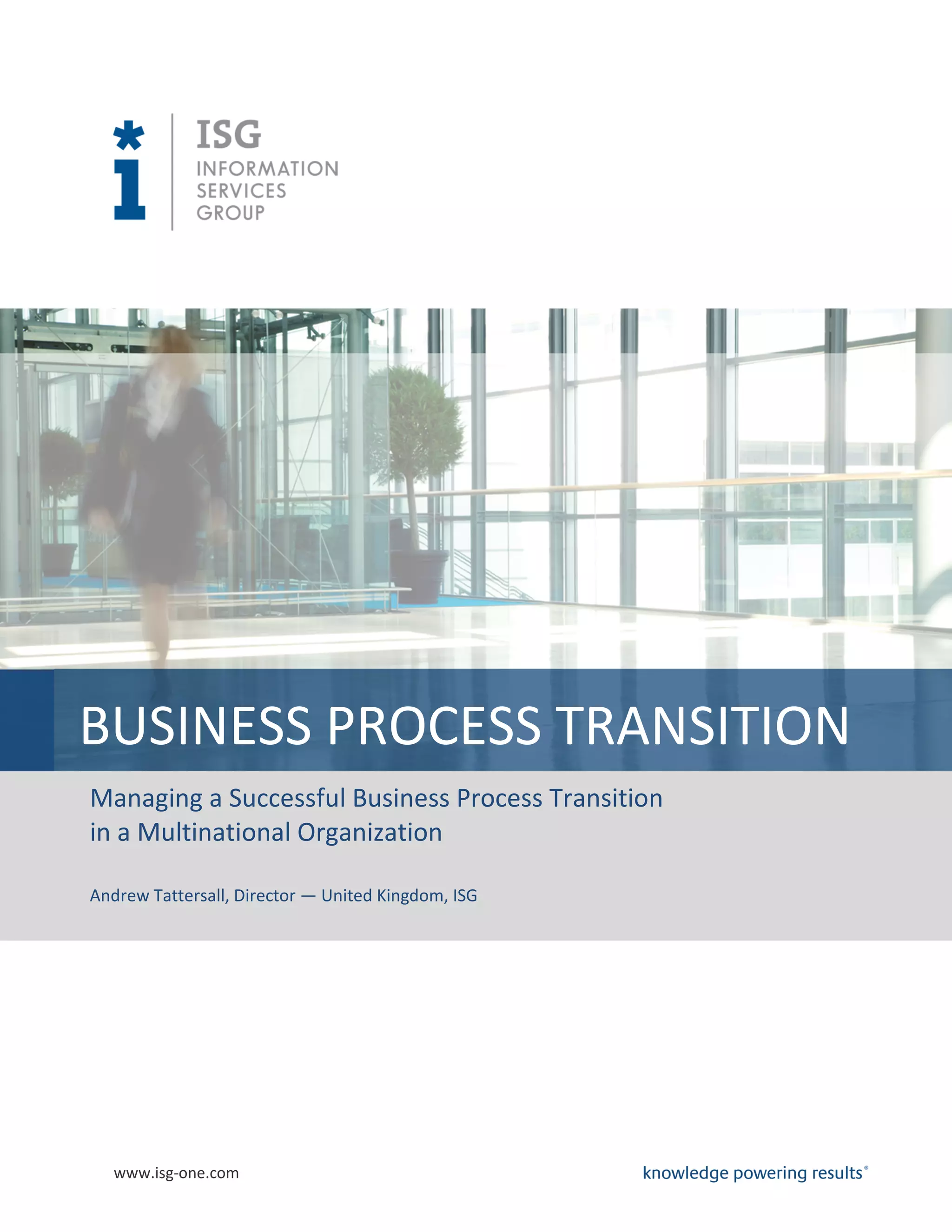 This document discusses the complexities and best practices for managing successful business process transitions in multinational organizations, particularly in outsourcing scenarios. Key success factors include strong local management, clear communication, and the alignment of objectives across global and regional teams, while also emphasizing the importance of a structured approach to governance and performance management. The document highlights that a balance between maintaining oversight and building partnerships with service providers is crucial for achieving desired outcomes during the transition.