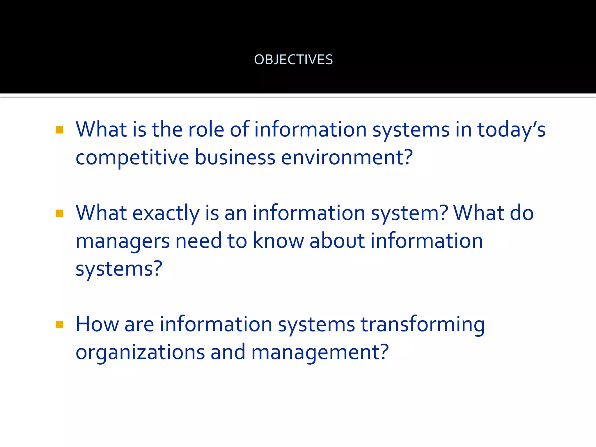 The document discusses the role of information systems in business and management. It defines management information systems and information systems in general. Key points covered include: (1) Information systems help organizations adapt to changes in the global economy, shift to knowledge-based industries, and transform business models; (2) An information system has components that collect, process, store, and distribute data to support decision making; (3) Information systems impact major business functions and organizational elements like structure, culture, and management; (4) Computer technology tools like hardware, software, and networks enable information systems.