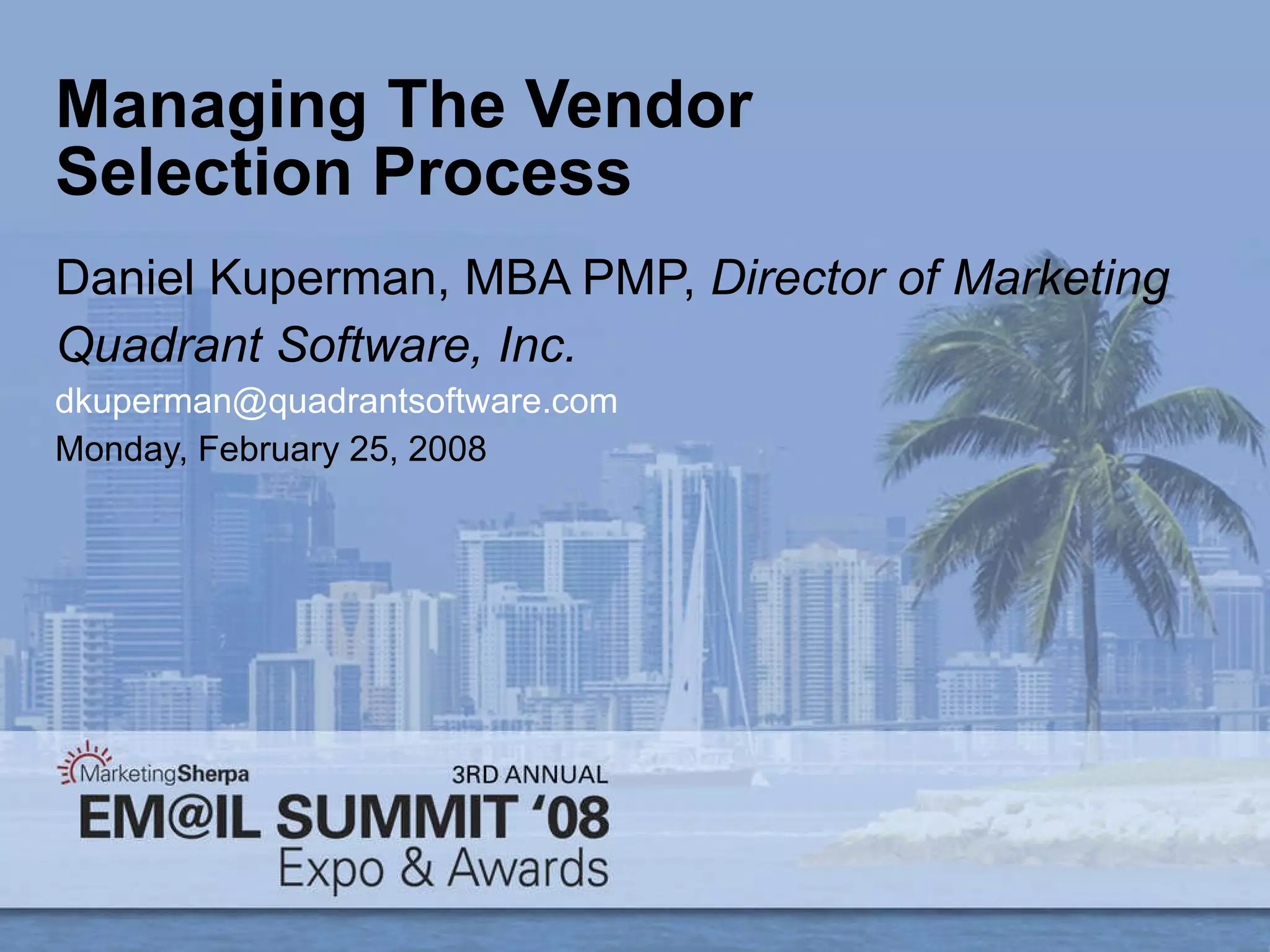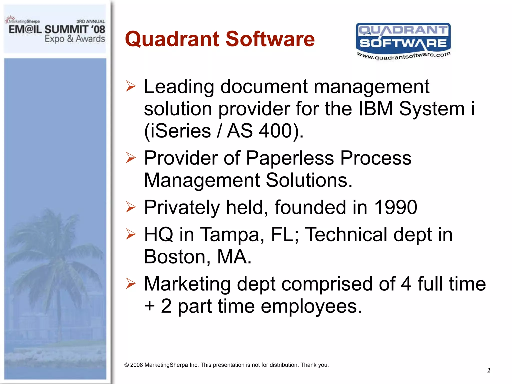 This document outlines the challenges faced by Quadrant Software's marketing department in managing their email marketing processes, highlighting the need for improved solutions for segmentation, reporting, and efficiency. The presentation details their goals for a new email software, the vendor selection process, and key lessons learned about ensuring clear requirements and effective team collaboration. Recommendations include engaging with sales for buy-in, asking detailed questions, and using a matrix for feature comparison while considering the company's needs and objectives.
