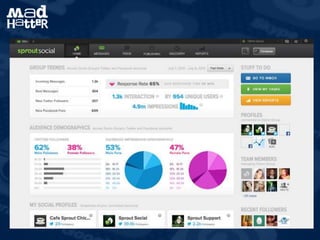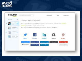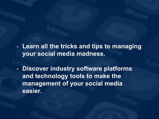 The document outlines strategies and tools for effectively managing social media, emphasizing the use of scheduling apps, monitoring tools, and analytics. It includes case studies, tips for best practices, and cautions against common pitfalls. Overall, the importance of organization and leveraging technology to optimize social media engagement and brand visibility is highlighted.