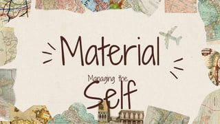 The document discusses the concept of the material self and how it develops over the lifespan. It describes views from philosophers William James and Jean-Paul Sartre on how people connect to objects and develop an identity through their possessions. Russell Belk's research on the material self is mentioned, including how objects can become extensions of ourselves. The document then discusses how the material self is composed of the body, clothes, immediate family, and home, and how possessions help people manage their identities in different life stages from infancy to old age.