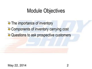 This document discusses inventory management, emphasizing the importance of understanding inventory costs, components, and customer needs. It covers the objectives of inventory, carrying costs calculations, and the significance of qualitative and quantitative data in optimizing inventory. The document concludes with key questions for assessing inventory practices and strategies to improve service levels while minimizing costs.
