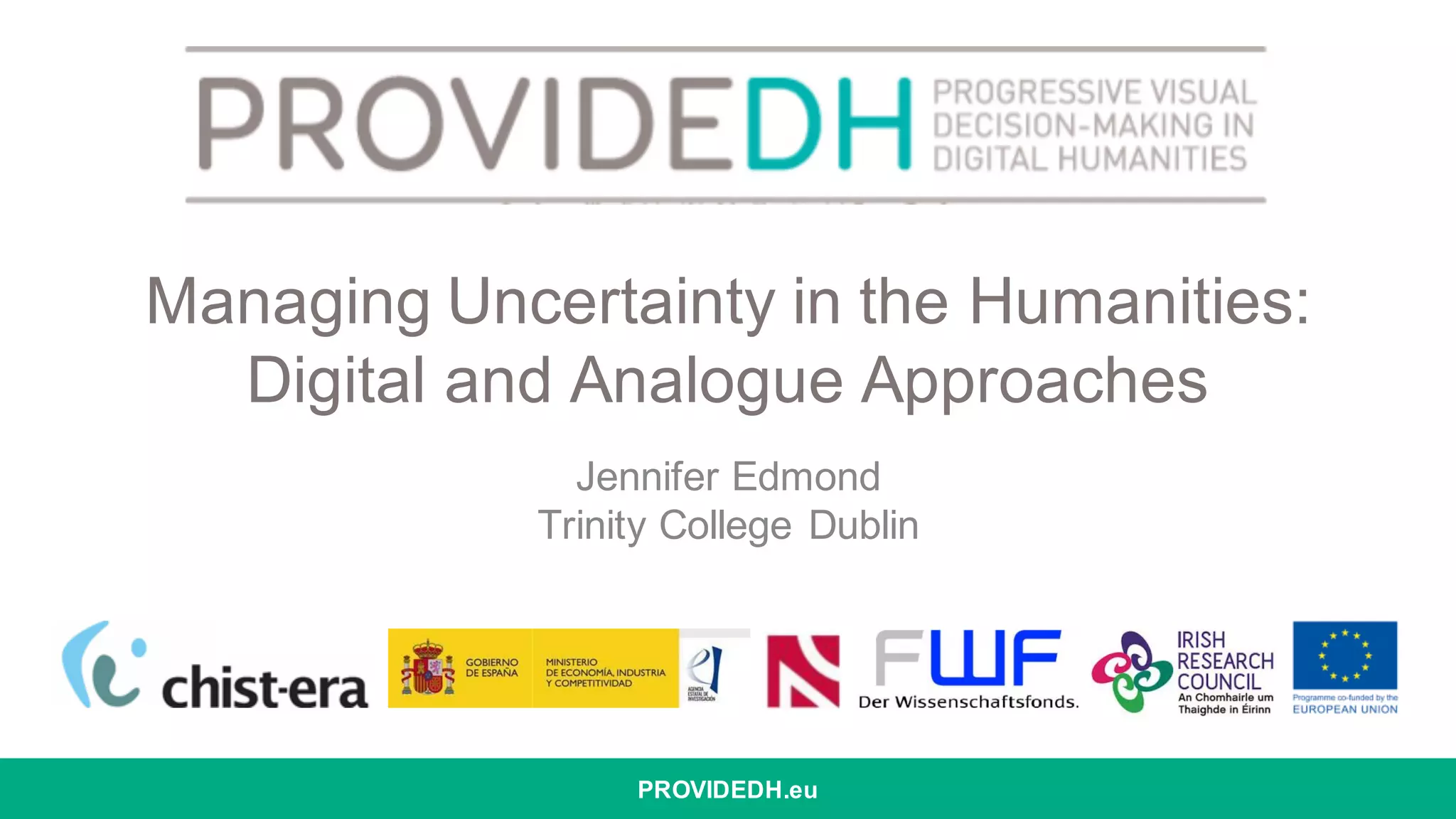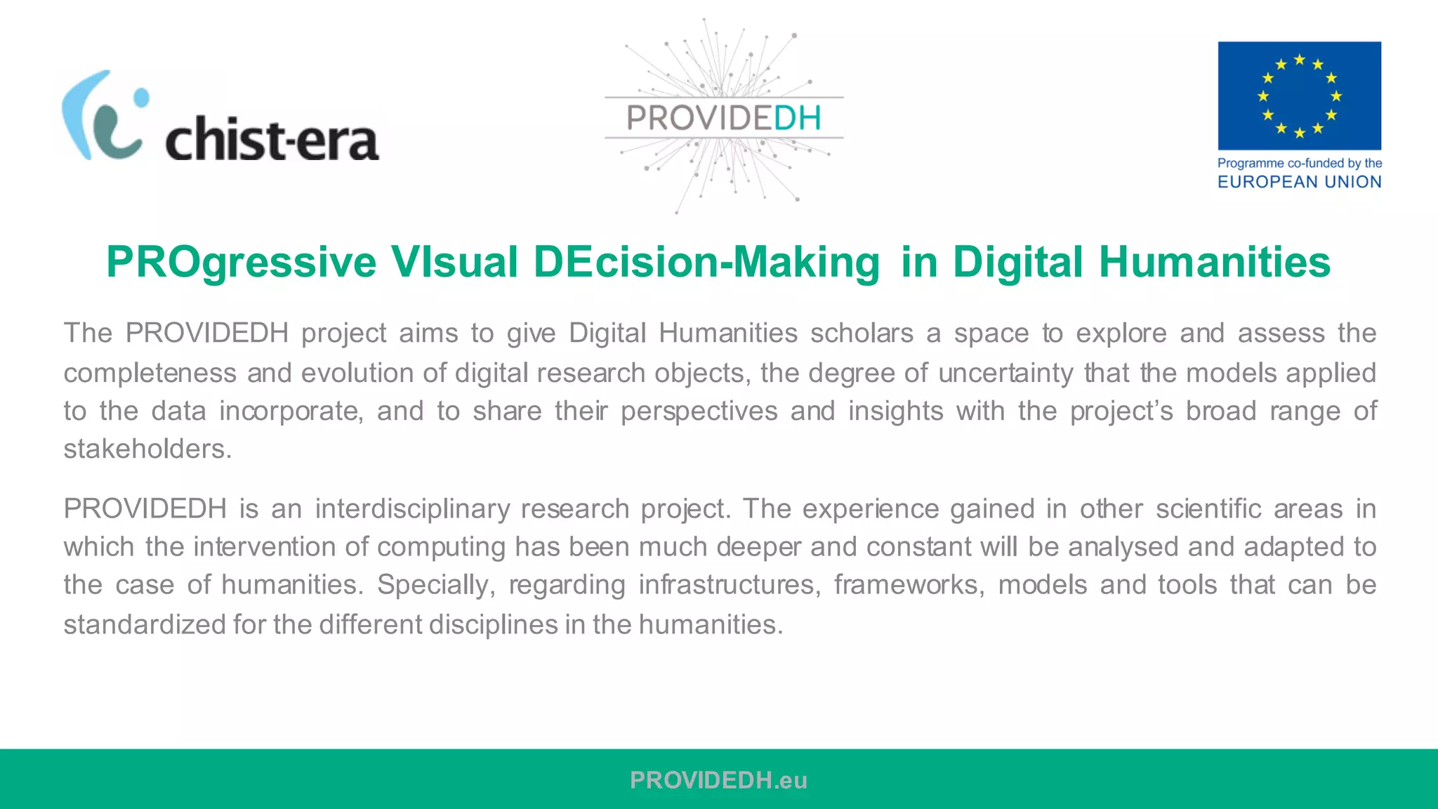 The PROVIDEDH project aims to give Digital Humanities scholars tools to explore research objects and the degree of uncertainty in models applied to data. It is an interdisciplinary project that will analyze and adapt approaches from other fields where computing has been applied more extensively. The goal is to standardize infrastructures, frameworks, models and tools across different humanities disciplines.