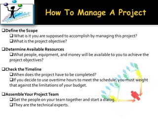 Managing a project involves defining its scope, determining available resources, checking the timeline, assembling the project team, listing major and minor steps, developing a preliminary plan, creating a baseline plan, documenting changes, and keeping stakeholders informed of progress and problems. Leading a project focuses on results and productivity rather than time, aligning people with work they are good at and passionate about, putting best performers on biggest opportunities, finding a balance between aggressive and realistic goals, trusting employees, making employees think rather than providing all answers, and building consensus by explaining why.