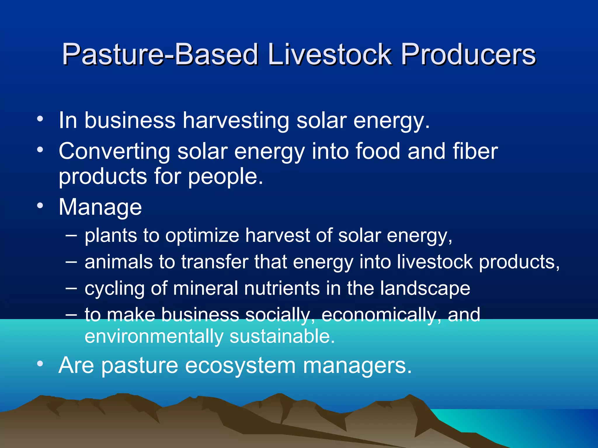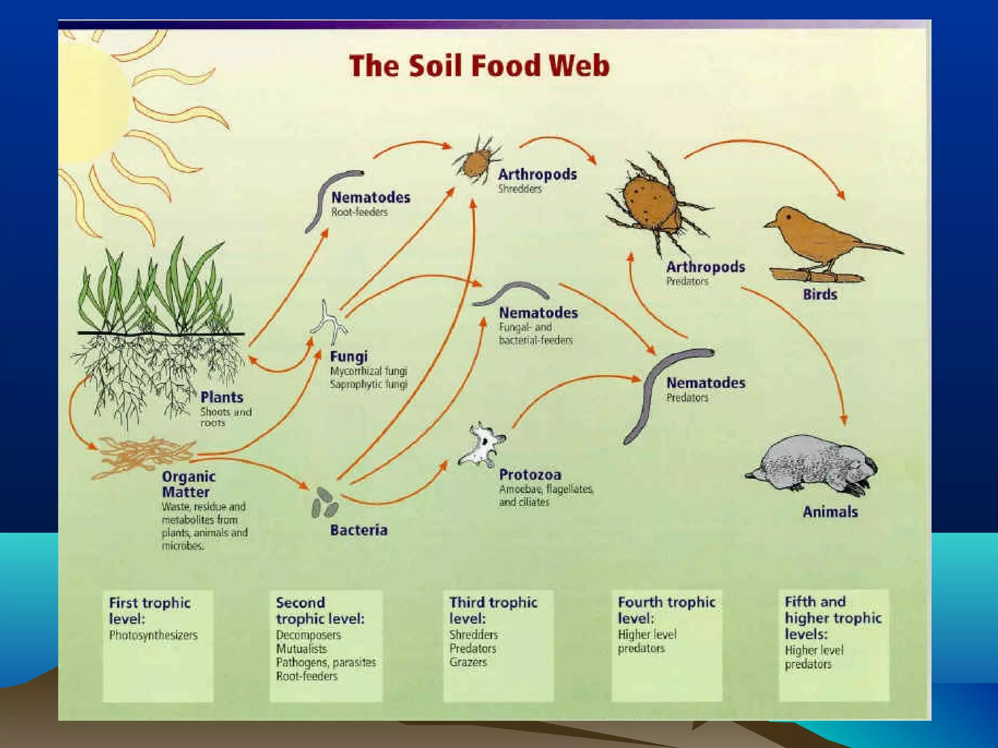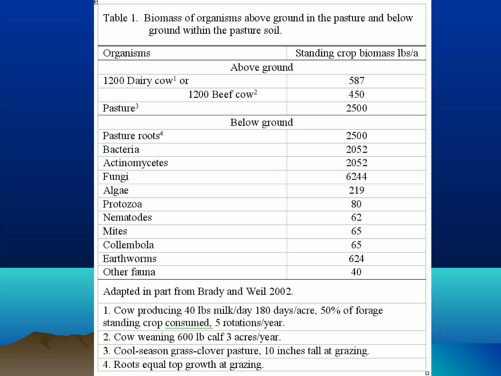 This document discusses managing pasture ecosystems by considering the interactions between plants, animals, soil organisms, and nutrient cycles that are often invisible. As pasture managers, we harvest solar energy through plants and convert it to food and fiber through grazing animals, while maintaining nutrient cycling and soil health. A diverse community of soil organisms like bacteria, fungi, protozoa, nematodes, arthropods, and earthworms cycle nutrients, aerate soil, hold water and support plant growth. Management aims to maintain this below-ground ecosystem through practices like maintaining soil organic matter, nutrient recycling, and grazing management. Understanding the soil food web allows for better holistic management of pasturelands.