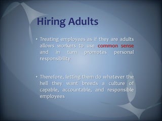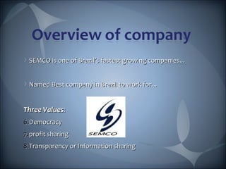 Semco is a Brazilian company known for its unique organizational structure and values of democracy, profit sharing, and transparency. It replaced the traditional hierarchical pyramid structure with concentric circles to promote more employee involvement in decision making. Some key decisions are made through company-wide votes. Semco also believes in profit sharing and treating employees as partners rather than subordinates. This empowers employees and has led to Semco's success in becoming one of Brazil's fastest growing companies.