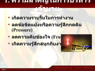 Develop and Maintaina Relationship That : āļāļąāļāļāļēāđāļĨāļ°āļāļģāļĢāļāđāļ§āđāļāļķāđāļāļāļ§āļēāļĄāļŠāļąāļĄāļāļąāļāļāđāļāļķāđāļāđāļāļ·āđāļāļāļđāļĨāļāļąāļāļāļąāļāļāļĩāđ Fits Both Your Needs and Styles āđāļŦāļĄāļēāļ°āļŠāļĄāļāļąāļāļāļ§āļēāļĄāļāđāļāļāļāļēāļĢāđāļĨāļ° āļ§āļīāļāļĩāļāļēāļāļŦāļĢāļ·āļāđāļāļāļāļĒāđāļēāļāļāļāļāļāļļāļ āđāļĨāļ°āļāļāļāļāļēāļĒ Is Characterized by Mutual Expectation āļĄāļĩāļĨāļąāļāļĐāļāļ°āļāļĩāđāļāļĢāļāļāļąāļāļāļ§āļēāļĄāļāļēāļāļŦāļĄāļēāļĒāļāļāļāļāļąāđāļāļŠāļāļāļāđāļēāļĒ Keeps Your Boss Informed āļāđāļēāļ§āļŠāļēāļĢāļāđāļāļĄāļđāļĨāļāļĩāđāļāļļāļāļĄāļĩāļāļ§āļĢāđāļŦāđāļāļēāļĒāđāļāđāļĢāđāļ§āļĄāļĢāļąāļāļĢāļđāđāđāļŠāļĄāļ āļŦāļĢāļ·āļāļāļĒāļēāļĒāļēāļĄāļāļđāļāļāļļāļĒāđāļĨāļāđāļāļĨāļĩāđāļĒāļāļāļ§āļēāļĄāļāļīāļāđāļŦāđāļāļāļąāļāļāļĒāđāļēāļāļŠāļĄāđāļģāđāļŠāļĄāļ ** āđāļāđāļēāđāļāļāļēāļĒāļāļāļāļāļļāļāđāļĨāļ°āđāļāđāļēāđāļāļāļāđāļāļ ** (Understanding the Boss and Yourself)