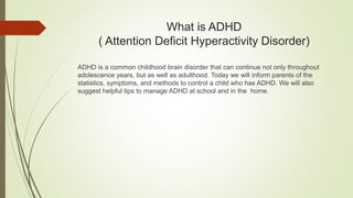 This document discusses recognizing and managing ADHD in children. It begins by providing statistics on ADHD, such as that 6.4 million American children have been diagnosed and males are 3 times more likely than females to have it. It then describes common signs and symptoms, including inattention, hyperactivity, and impulsiveness. Methods for controlling ADHD are presented, such as medication, psychotherapy, and working with the child's school. The document concludes by emphasizing the importance of research to better understand and treat ADHD.