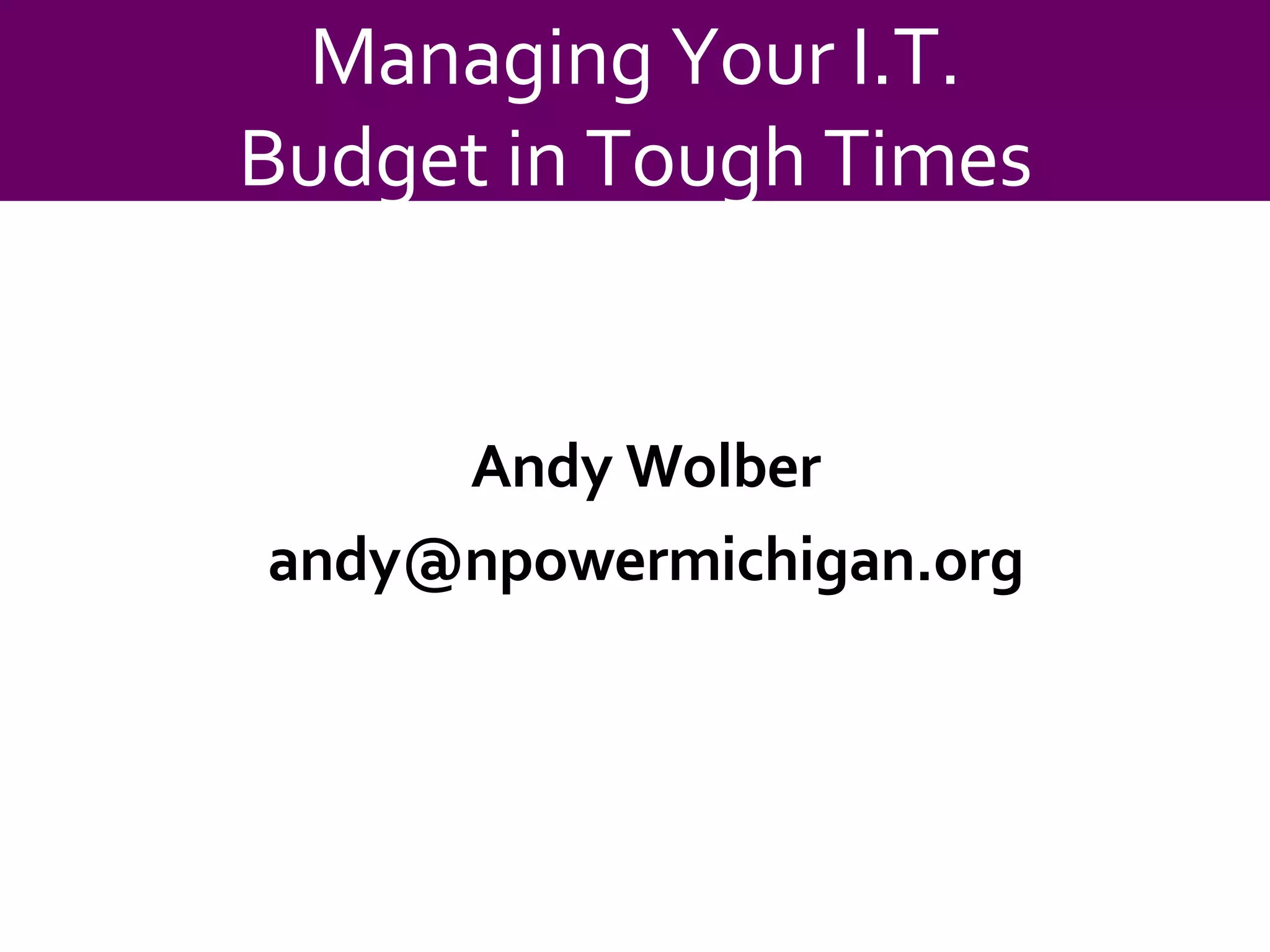 The document discusses managing an IT budget for nonprofits in tough economic times. It provides tips on reducing costs such as using laser printers instead of inkjet, networked copiers instead of individual printers, and open source or free software instead than paid alternatives. The document also discusses moving operations and services to the cloud to reduce infrastructure costs and improve efficiency. It includes statistics on current nonprofit IT spending, staffing, and priorities from a survey of 330 organizations.