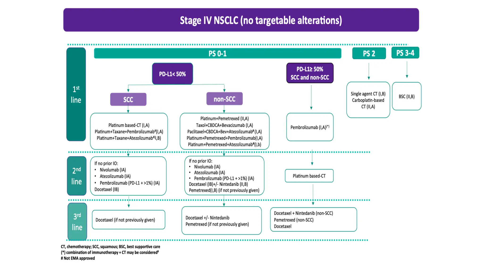 The document presents a comprehensive overview of lung cancer management, focusing on non-small cell lung cancer (NSCLC) and small cell lung cancer (SCLC) treatment pathways, including staging, diagnostic workup, and treatment classifications. Key points include the importance of lymph node staging, the role of low-dose CT in screening high-risk individuals, and surgical resection as standard care for early-stage NSCLC. Additionally, it discusses adjuvant therapies, the impact of ongoing clinical trials, and the necessity of personalized treatment based on patient risk factors.