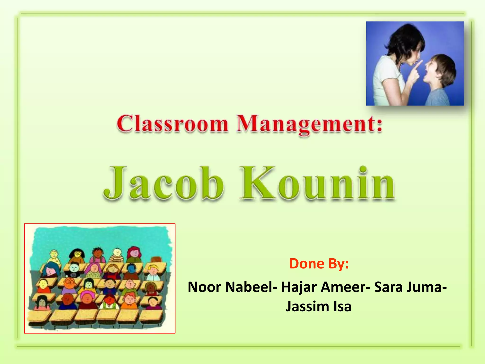 Jacob Kounin was an educational psychologist and classroom management theorist. He studied classroom behavior and developed principles for managing student behavior and movement in the classroom. Some of his key principles included with-it-ness, where the teacher is aware of what all students are doing; overlapping, where the teacher attends to multiple events at once; and momentum, where lessons are kept moving with smooth transitions to maintain student engagement. Kounin's work emphasized the importance of actively involving all students, addressing misbehaviors promptly, and designing engaging lesson plans to minimize off-task behavior.