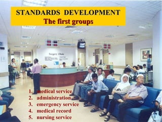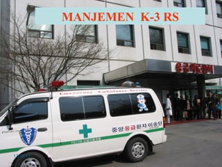 Dokumen tersebut membahas tentang standar K3 (Kesehatan, Keselamatan Kerja dan Kebakaran) di rumah sakit. Terdapat beberapa poin penting K3 yang perlu dipenuhi rumah sakit untuk mendapatkan akreditasi, seperti pencegahan kebakaran, keamanan pasien, kesehatan kerja pegawai, pengelolaan bahan berbahaya, sanitasi lingkungan kerja, dan penanganan sampah medis. Dokumen ini juga menjelaskan tentang panduan dan