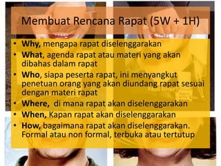 Dokumen ini membahas manajemen rapat dengan memfokuskan pada lima elemen dasar: why (kenapa rapat diselenggarakan), what (agenda rapat), who (peserta rapat), where (lokasi rapat), when (waktu rapat), dan how (cara pelaksanaan rapat). Penekanan diberikan pada pentingnya persiapan agenda yang baik, pemilihan peserta yang tepat, dan disiplin waktu dalam penyelenggaraan rapat. Selain itu, juga dibahas aspek konsumsi dalam rapat yang harus diperhatikan sesuai dengan durasi dan format rapat.