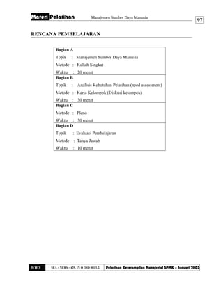 Dokumen ini adalah materi pelatihan manajemen sumber daya manusia yang bertujuan untuk meningkatkan pemahaman peserta tentang manajemen SDM dalam konteks rumah sakit dan puskesmas. Materi mencakup pentingnya SDM, proses, dan metode manajemen SDM seperti pengadaan, pemeliharaan, dan pengembangan pegawai. Pelatihan melibatkan berbagai metode, termasuk kuliah, diskusi kelompok, dan tanya jawab, serta fokus pada penerapan konsep manajemen yang manusiawi dan kemitraan di tempat kerja.
