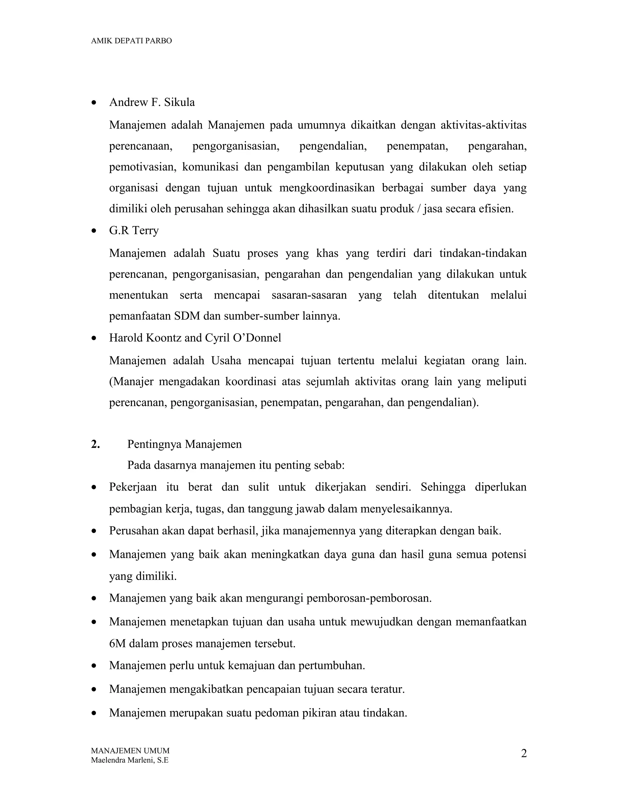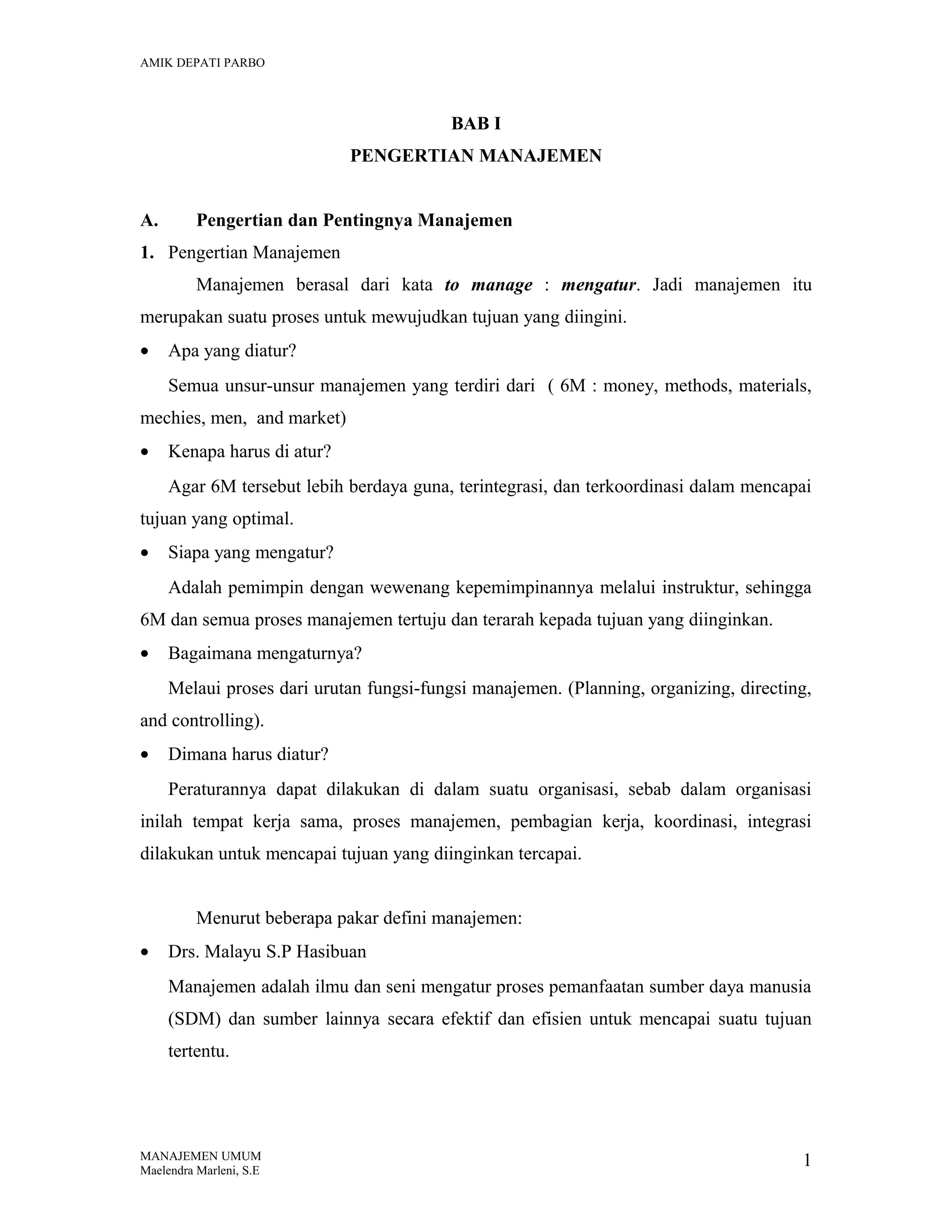 Dokumen ini menjelaskan pengertian dan pentingnya manajemen sebagai proses untuk mencapai tujuan melalui pengaturan 6M (uang, metode, material, mesin, manusia, dan pasar). Manajemen memiliki fungsi dasar seperti perencanaan, pengorganisasian, pengarahan, dan pengendalian, serta berfokus pada pengembangan teori manajemen yang mencakup aliran klasik, hubungan manusiawi, dan modern. Dengan prinsip-prinsip dan azas-azas yang jelas, manajemen diperlukan untuk efektivitas organisasi.