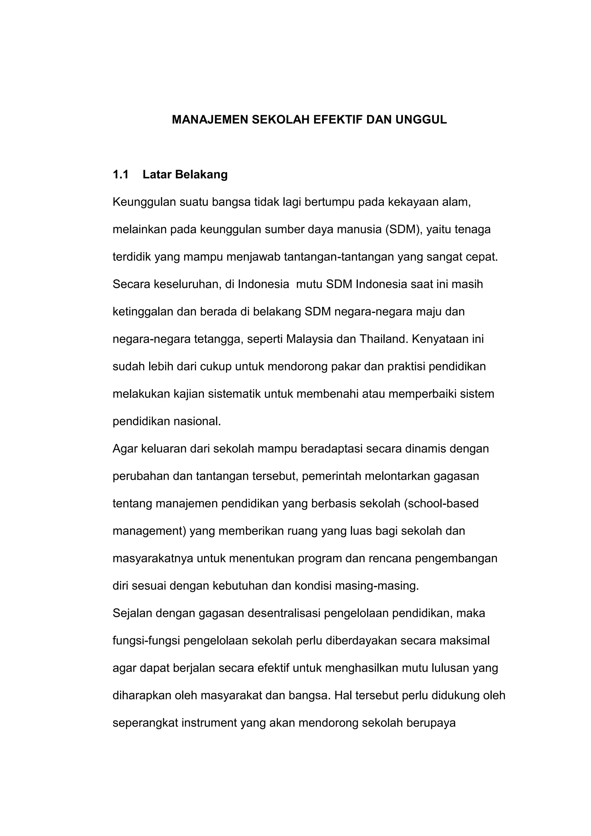 Teks tersebut membahas tentang manajemen sekolah yang efektif dan unggul. Ada beberapa poin penting yang diangkat yaitu (1) peningkatan mutu sumber daya manusia perlu dilakukan untuk bersaing di era global, (2) dibutuhkannya manajemen sekolah berbasis sekolah untuk meningkatkan kualitas lulusan, (3) karakteristik sekolah efektif antara lain kepemimpinan yang kuat dan harapan tinggi terhadap