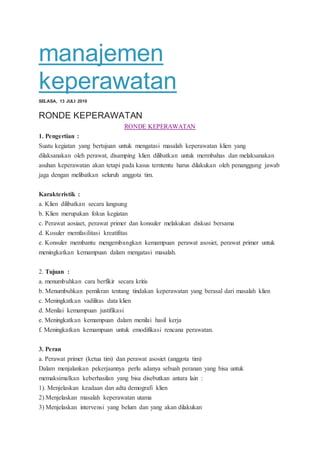 Dokumen ini membahas tentang manajemen keperawatan, termasuk pengertian, tujuan, peran, dan langkah-langkah dalam ronde keperawatan serta supervisi keperawatan. Ronde keperawatan melibatkan klien dan bertujuan untuk meningkatkan kemampuan perawat dalam menangani masalah klien, sedangkan supervisi bertujuan untuk meningkatkan kualitas layanan dan akuntabilitas perawat. Dokumentasi keperawatan juga dijelaskan sebagai elemen penting untuk mendokumentasikan pelayanan profesional dan memastikan kualitas perawatan yang diberikan.