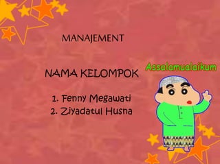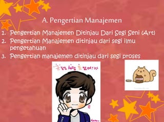 Dokumen tersebut membahas tentang manajemen, meliputi pengertian, fungsi, teori, dan bidang-bidang manajemen. Secara ringkas, manajemen adalah proses perencanaan, pengorganisasian, pelaksanaan, dan pengawasan untuk mencapai tujuan organisasi. Fungsi-fungsi manajemen meliputi perencanaan, pengorganisasian, pelaksanaan, dan pengawasan. Sedangkan bidang-bidang manajemen yang dijelaskan adalah produksi,