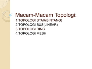 Terdapat 4 jenis topologi jaringan komputer yaitu star, bus, ring, dan mesh. Topologi star memiliki keuntungan mudah dipasang dan pemeliharaan, tetapi menggunakan banyak kabel. Topologi bus hemat kabel tetapi rawan gangguan. Topologi ring dan mesh lebih handal namun sulit dikembangkan dan mahal.