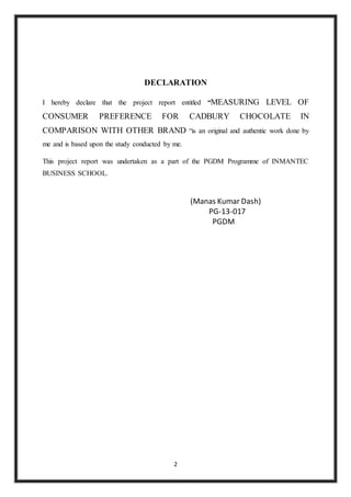The document presents a research study focused on measuring consumer preference for Cadbury chocolate compared to other brands like Nestlé and Amul, highlighting extensive market research and consumer behavior analysis. It notes that Cadbury is the market leader, capturing a significant share, and explores factors influencing consumer choices such as packaging, pricing, and advertising. The study includes methodologies, data analyses, findings, and recommendations based on consumer interviews and surveys conducted in Central Perk, Delhi.