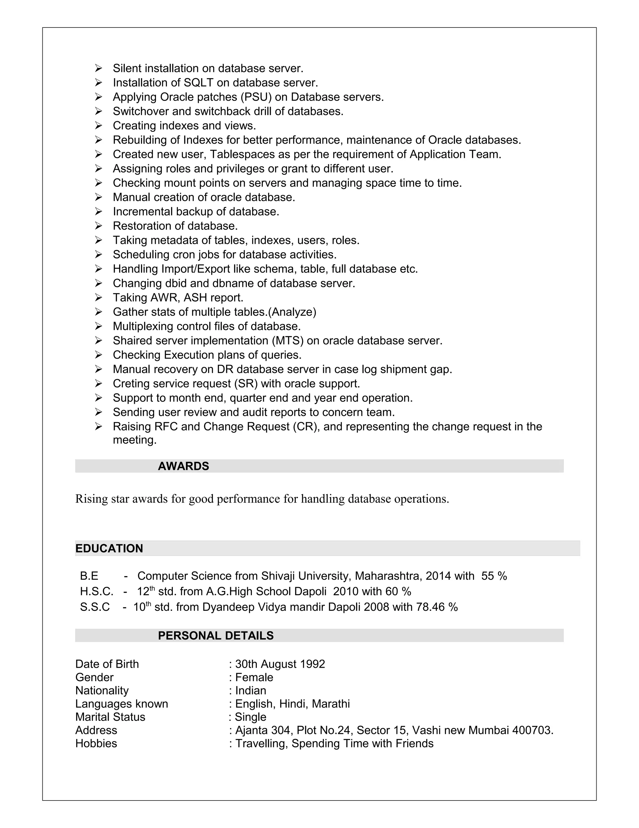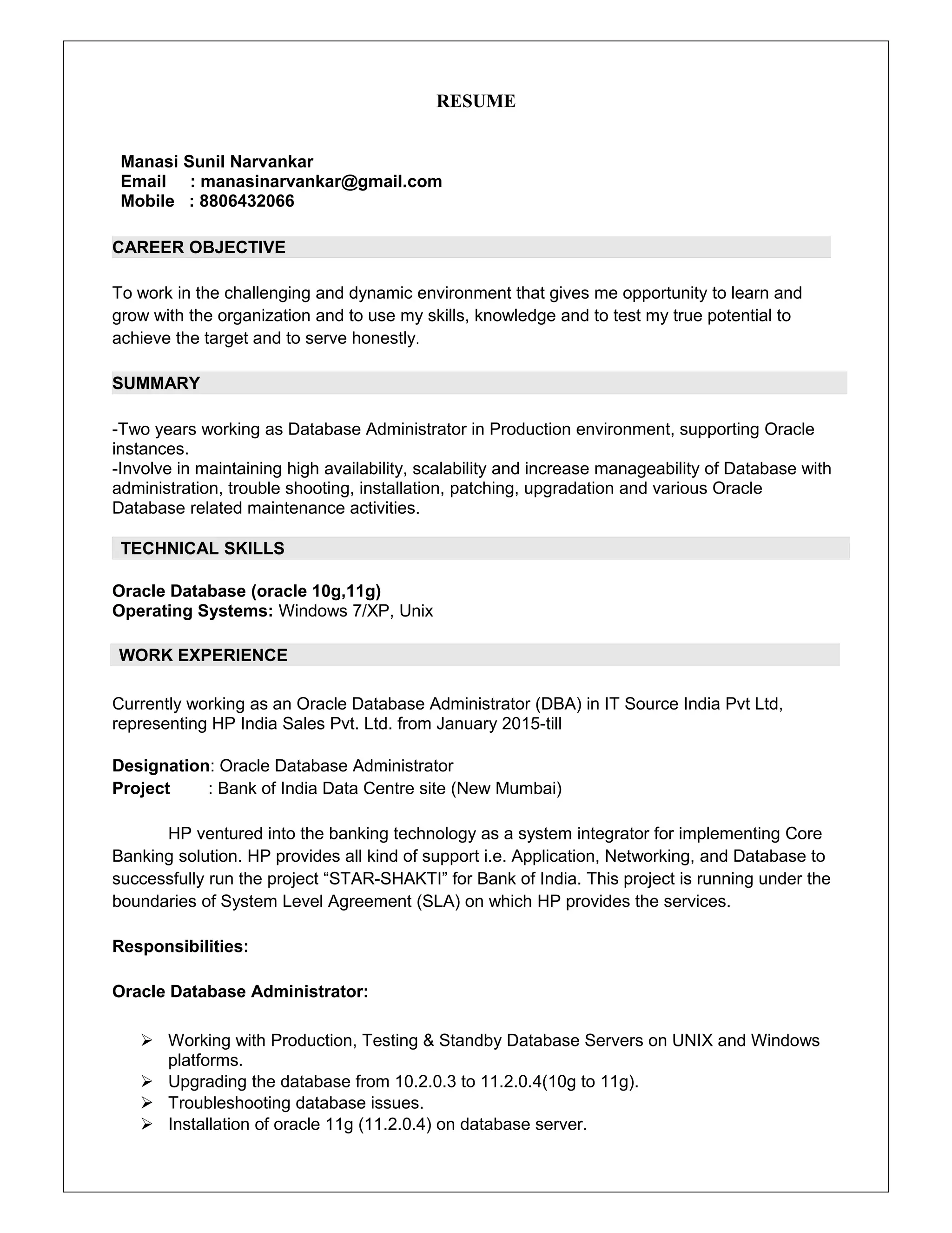 Manasi Sunil Narvankar is seeking a job that allows her to learn and grow. She has two years of experience as a Database Administrator supporting Oracle instances. Her responsibilities included database administration, troubleshooting, installation, patching, and upgrades. She currently works as an Oracle DBA for IT Source India Pvt Ltd, representing HP India Sales Pvt. Ltd., where her duties involve working with production, testing, and standby databases and upgrading databases from 10g to 11g.