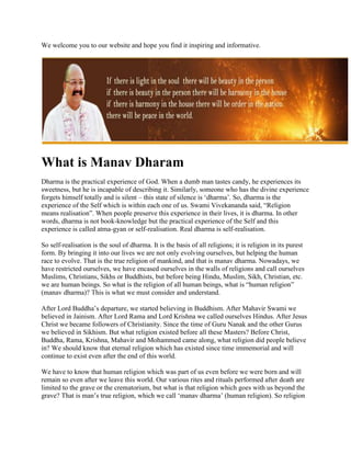 The document introduces Manav Dharam, which is described as realizing one's innate potential and spiritual essence. It encompasses the teachings of all religions and is the eternal wisdom of the soul. The organization Manav Utthan Sewa Samiti, founded by Shri Satpal Ji Maharaj, aims to manifest this knowledge through spiritual conferences and social service programs around the world. Shri Satpal Ji Maharaj, born in 1951, showed spiritual tendencies from a young age and grew up helping others realize their inner potential under the guidance of his enlightened father.
