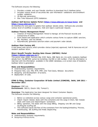 This resume is for Manav Sachdeva, who has over 7 years of experience in software development and enhancement. He currently works for HCL Infosystems in Noida, India. Some of his key skills and experiences include developing web and mobile applications using Java/J2EE, MySQL, and Agile methodologies. He has worked on projects for clients such as UIDAI, CONCOR, and Gulf News, where he was involved in all phases of the development lifecycle from requirements to implementation. His educational background includes an MCA from Maharishi Dayanand University.