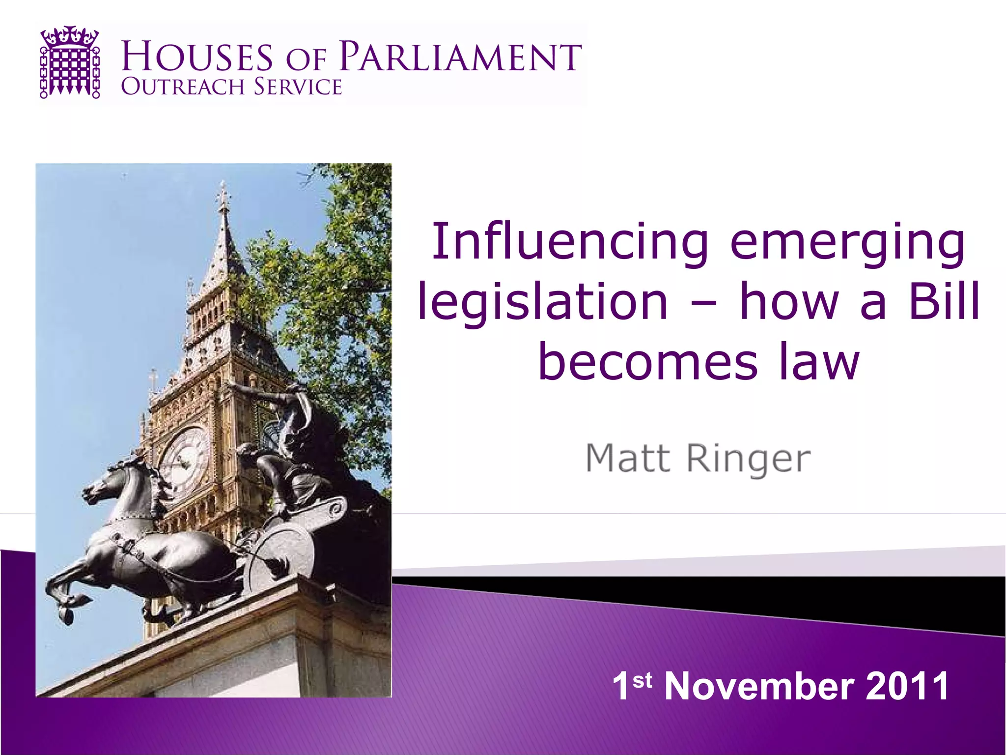 The document outlines the process for how a bill becomes law in the UK parliament. It involves multiple stages including contributions to government consultations, submitting evidence to joint committees considering draft bills, researching and contacting MPs to influence debates at second and third readings, and engaging with the House of Lords process if the bill passes the Commons. The entire process requires influencing both elected representatives and peers at each step to help shape the final legislation.