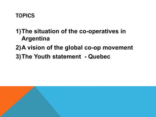 The document discusses three topics: 1) The success of cooperatives in Argentina with 30,000 cooperatives across all economic sectors employing over 13,000 workers in 311 recovered companies. 2) The global cooperative movement involves 1 billion members worldwide and provides 250 million jobs according to CICOPA. It also notes the youth employment crisis with 73.4 million unemployed youth. 3) The youth statement from Quebec raises aspects to consider such as what economic model is needed, understanding democratic participation, and better organizing to increase youth participation.