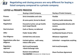 The document provides an overview of the key differences between acquiring a listed company versus a private company. It notes that buying a listed company has a strict defined legal process and timetable that must be followed, including requirements for public tender offers, limited negotiation timelines, and regulatory approvals. In contrast, acquiring a private company allows for a more flexible informal process, with unlimited potential to renegotiate terms. It also outlines the major third party advisors involved in M&A deals and the substantial costs that can be incurred, even for failed acquisition attempts.