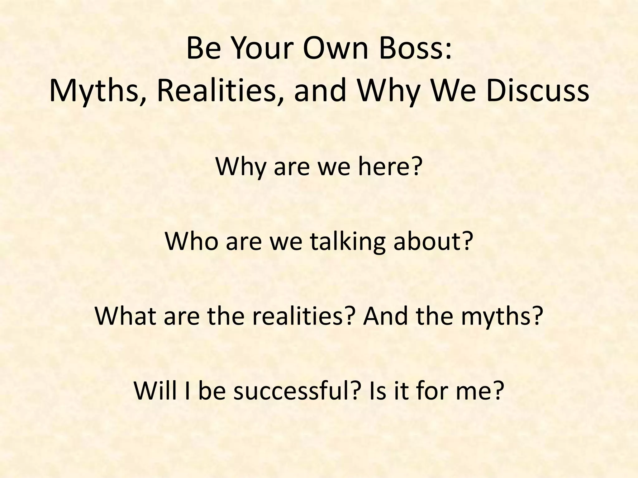 This document discusses myths and realities of small business ownership and entrepreneurship. It notes that small businesses are the primary job creators and make up over 99% of US employers. While definitions vary, both entrepreneurs and small business owners contribute significantly to the economy. Common myths include that starting a business is easy and will make you rich quickly. In reality, success depends on traits like passion, creativity, willingness to learn from mistakes, and strong people skills. These traits can be learned. The document provides resources for small business owners seeking more information.