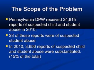 The document discusses Pennsylvania's mandatory reporting laws for suspected child abuse. It provides statistics on reported and substantiated child abuse cases in Pennsylvania in 2010. It outlines who is required to report suspected abuse, including professionals who work with children, and the process for making oral and written reports. It defines what constitutes child abuse under Pennsylvania law, including physical abuse, sexual abuse, neglect, and specific criminal offenses. The duties of mandated reporters to disclose suspected abuse are discussed.