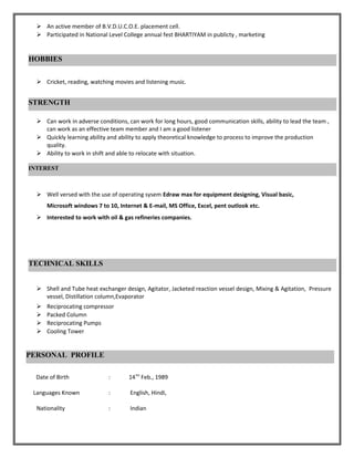 This document is a curriculum vitae for Mandeep Kumar. It summarizes his educational qualifications and technical skills. Mandeep holds a B.Tech in Chemical Engineering from Bharati Vidyapeeth Deemed University College of Engineering with percentages ranging from 50-62% across semesters. His technical skills include designing heat exchangers, reaction vessels, distillation columns and more using software like Edraw max. He is seeking opportunities in oil and gas refinery companies.