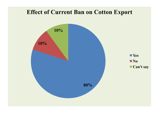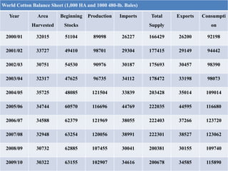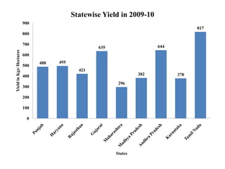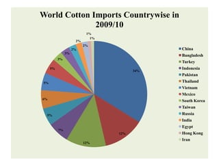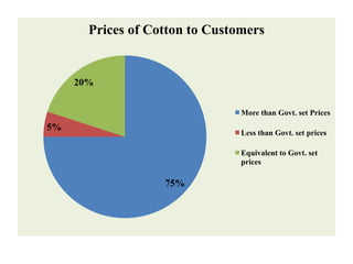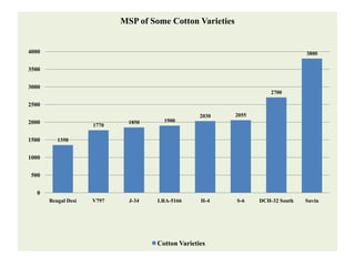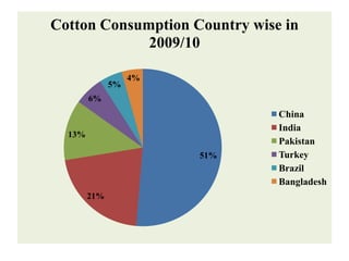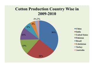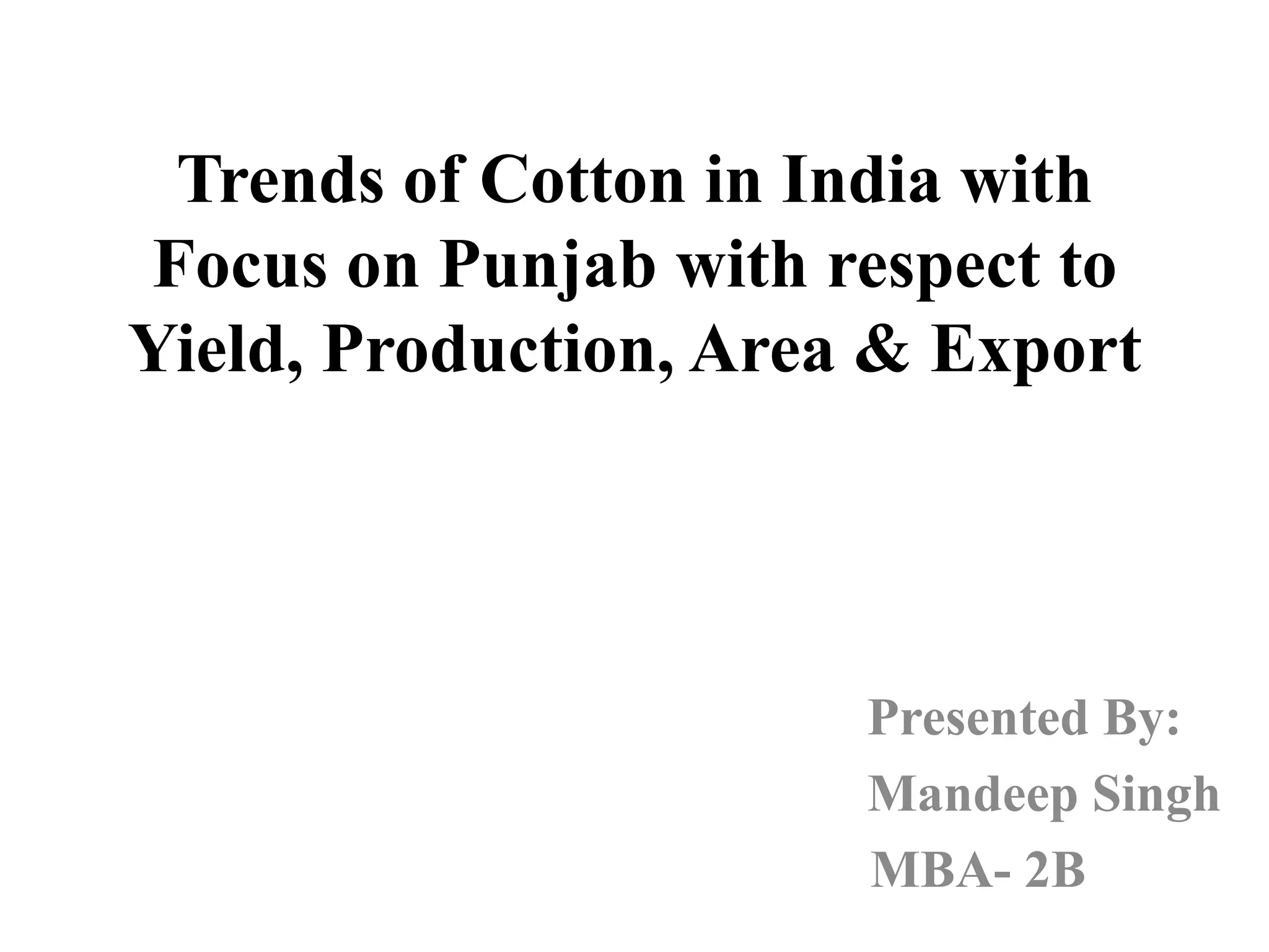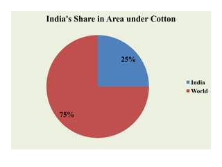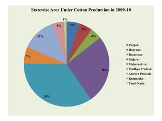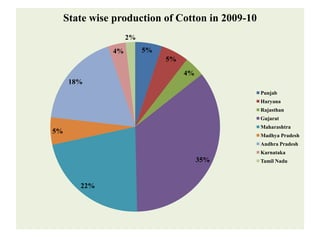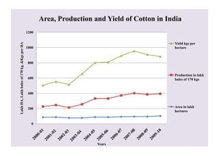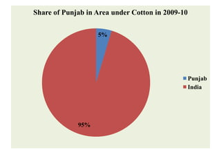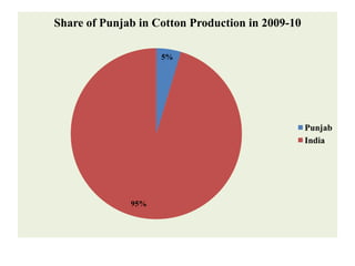 The document discusses trends in cotton production in India, with a focus on Punjab. It notes that while Punjab was once a major cotton producer, its production and area under cotton have declined in recent decades. This is due to several issues, including lack of irrigation, poor quality seeds, water pollution, and climate change impacts. The document also outlines initiatives by the Indian government to promote the cotton sector and improve yields and sustainability. It concludes by discussing expectations for the future of India's cotton industry.
