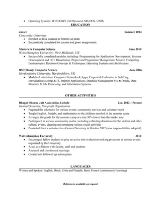 Mandeep Shekhon is a multilingual software developer with over 5 years of experience in programming, customer service, and the SDLC process. He is looking for a position as a software developer or tester. He has worked as a Java developer for SofTel Communications where he developed applications and databases. He also has experience as a technical support representative and software developer for other companies. Mandeep has a Master's degree in Computer Science and is proficient in languages like Java, C++, PHP, and technologies like Oracle, MySQL, and .NET. He is actively involved in his community as the General Secretary for a nonprofit organization.
