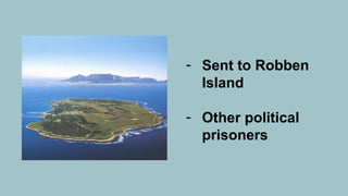 Mandela was sent to Robben Island prison off the coast of Cape Town in 1964 where conditions were bad and he performed hard labor in a quarry. He was allowed 6 month visits and letters and continued his studies. Over 3,000 other African political prisoners were also held in small cells. Mandela became a leader to the prisoners and helped set up an informal school. Conditions worsened over time even as more prisoners arrived and family visits became less frequent.