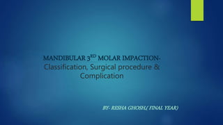 The document discusses impacted third molars, including their classification, surgical removal procedure, and potential complications. It begins with definitions of tooth impaction and discusses causes such as insufficient jaw space. It then covers classification systems involving angulation, depth, and relationship to surrounding structures. Indications for removal include recurrent infections, cysts/tumors, and facilitating other procedures. The surgical procedure is outlined in steps including incisions, bone removal, tooth sectioning and extraction. Risks like nerve injury are also addressed based on radiographic findings. In summary, the document provides an overview of impacted third molar diagnosis, treatment planning, surgical techniques and considerations.