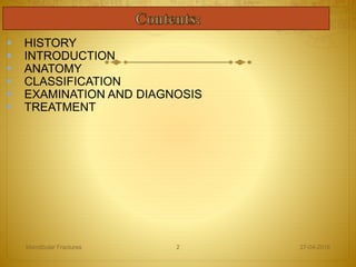 The document discusses the history, anatomy, classification, examination, diagnosis, and treatment of mandibular fractures. It traces the history from descriptions in ancient texts to modern techniques. The mandible has a unique anatomy as a bent bone that provides both compression and tension zones. Fractures are classified in various ways including by location, number of fragments, involvement of surrounding tissues, and relation to occlusion. Clinical examination involves inspection, palpation, and neurological and range of motion tests while radiographs help confirm and characterize fractures.