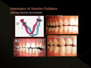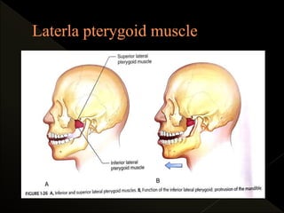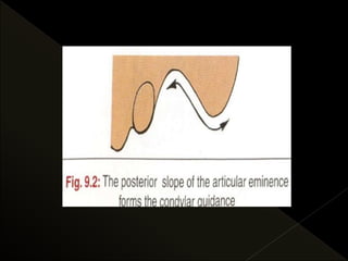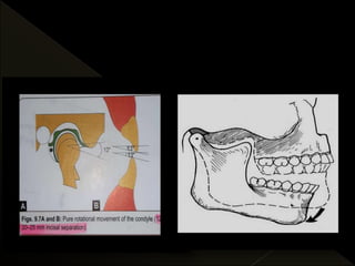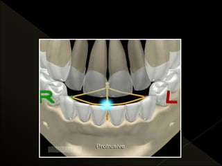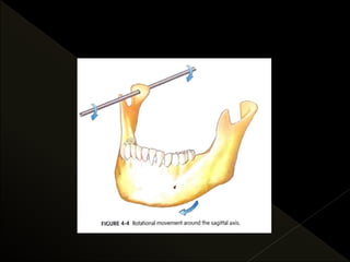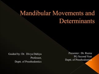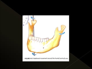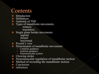 This document provides an overview of mandibular movements and the temporomandibular joint (TMJ). It discusses the anatomy of the TMJ, types of mandibular movements including rotation and translation, and the three planes of border movements: sagittal, frontal, and horizontal. It also examines the determinants of mandibular movement, including condylar guidance, anterior guidance, and the neuromuscular system. The chewing stroke and neuromuscular regulation of movement are described.