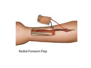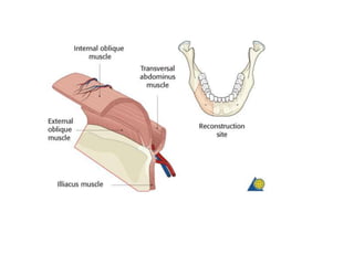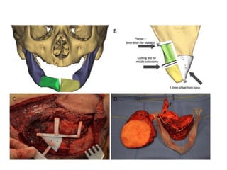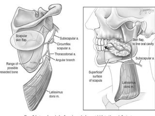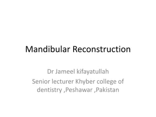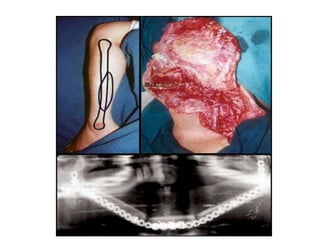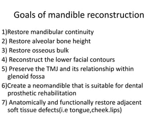This document discusses various techniques for mandibular reconstruction after resection for tumors or injuries. The goals of reconstruction are to restore mandibular continuity, alveolar bone height, facial contours and function. Options include reconstruction plates, non-vascularized bone grafts for smaller defects, and microvascular free flaps for larger defects or those needing implant placement. The fibula and scapula flaps are commonly used, providing adequate bone stock. Proper classification of defect type and immediate versus delayed reconstruction must be considered to achieve optimal aesthetic and functional outcomes.