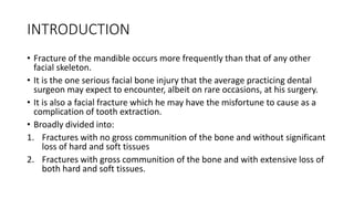 1. Mandibular fractures occur more frequently than other facial bone fractures and can be encountered by dental surgeons. They are broadly divided into fractures with or without bone communition and soft tissue loss.