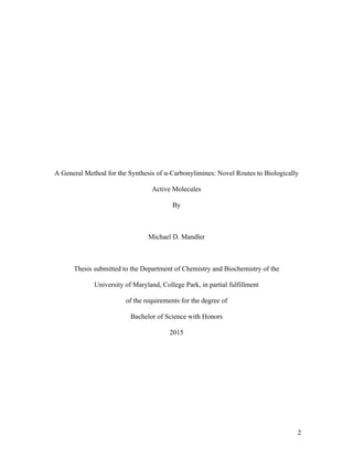 This document describes research into the development of a catalytic method for synthesizing α-carbonyl imines through the reaction of α-diazocarbonyl compounds and organic azides under mild conditions. Dirhodium tetraacetate catalyzes this reaction to produce imines containing polar functional groups like ketones and α-diesters in overnight reactions. The document also discusses the synthesis of 1,2,3,4-tetrahydropyrimidines from a [4+2] cycloaddition of an azadiene and aldimines catalyzed by zinc triflate. Finally, it presents a rhodium-catalyzed Wolff rearrangement and [2+2] cycloaddition that yields novel β-lact